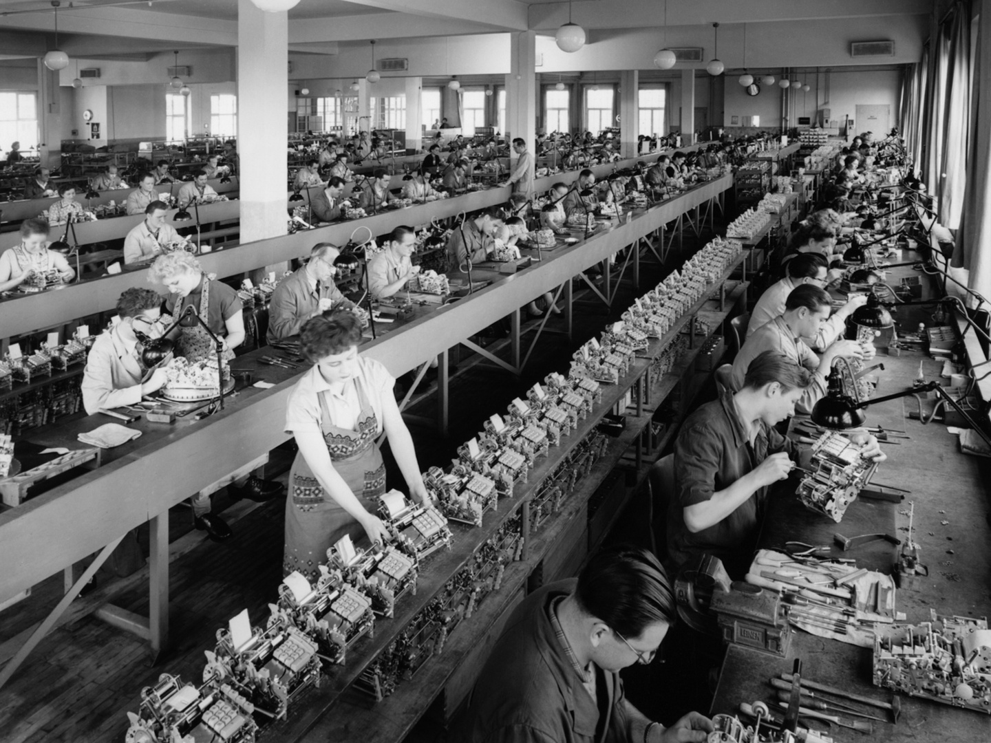 The subject of the photographer’s glossy images he created for advertisements and product catalogs are mainly various Brunsviga mechanical calculator models — at times with or without shadow effects, or even in starlight. With an eye for subtledetails and the technical refinements of the devices, advertised with the slogan “brains of steel,” Heidersberger mainly composed his images by montaging several individual shots together. And appearing almost always in the image as an indicator of technical progress: the power cord. It was an unmistakable sign of superiority over the purely mechanical products of the competition. His photographs of the production process, in turn, were intended to portraythe precision, meticulousness, and concentration required to manufacture the compact technical marvels by hand.